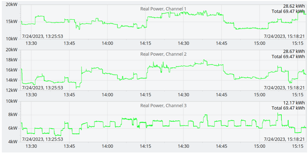 - Under “Interval“, you can view stripcharts for each channel of real power, including a total consumption measurement for the time shown.