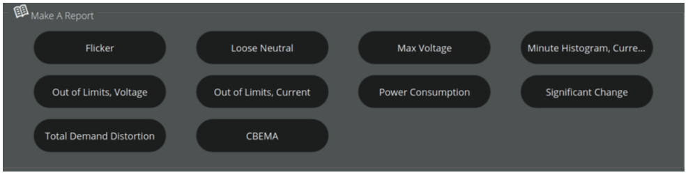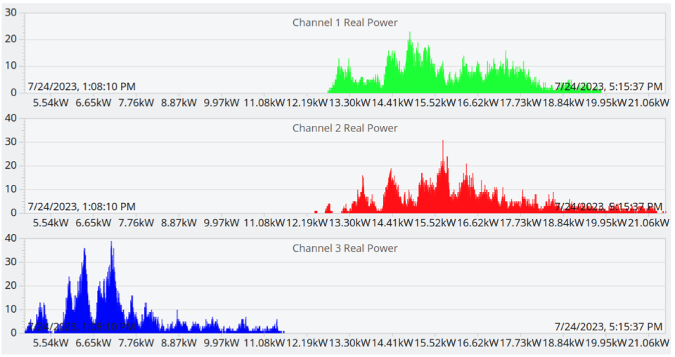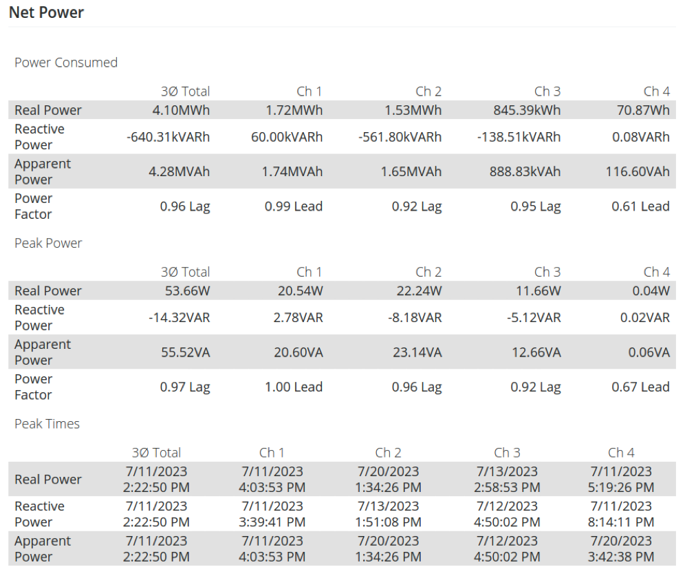 Recording reports create simple to understand outputs. For the purposes of sizing a backup, the Power Consumption report displays total and peak measures for real, apparent, and reactive power as well as power factor on all channels and the three phase total, if connected to a three phase system.