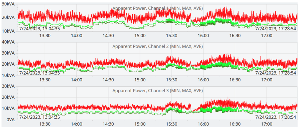 Looking at the maximum apparent power stripchart trace can be a quick and easy way of determining the maximum load in a system.