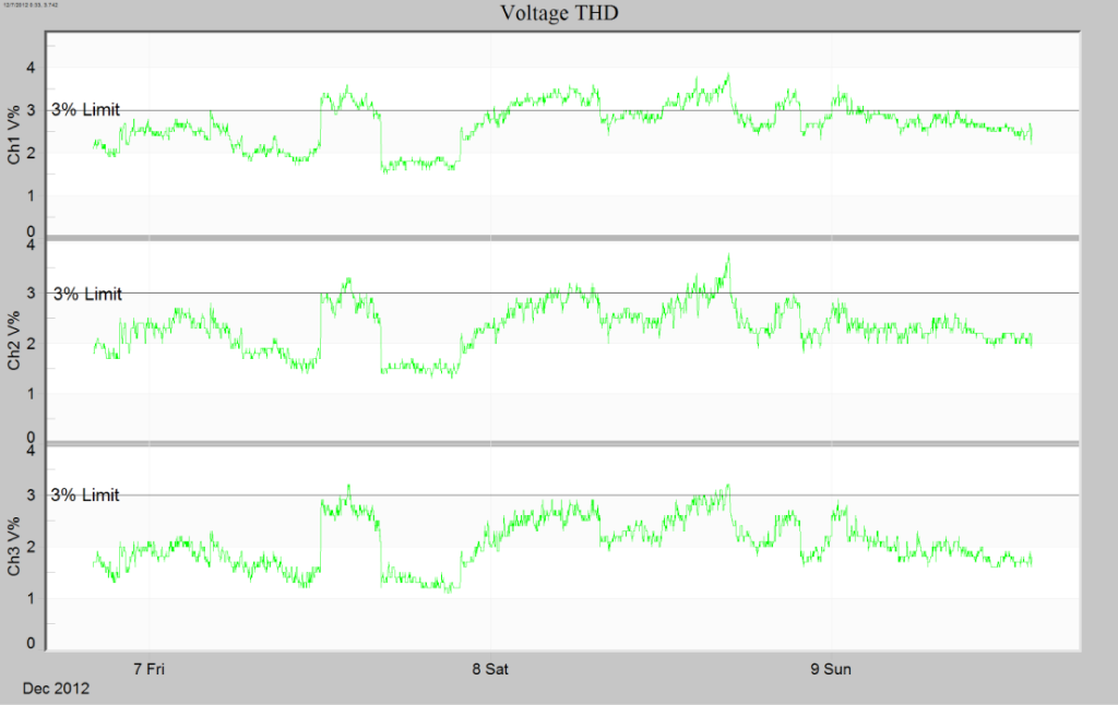 The annotation makes it easy to see that channel 1 has recorded values in excess of 3%. If this were a recording for a facility classified as “Special Purpose,” a fix would need to be made. The data from each voltage harmonic can be examined to find the specific harmonic (or harmonics) causing the problem. The data does indicate that the harmonic distortions are acceptable for the other 2 classes.